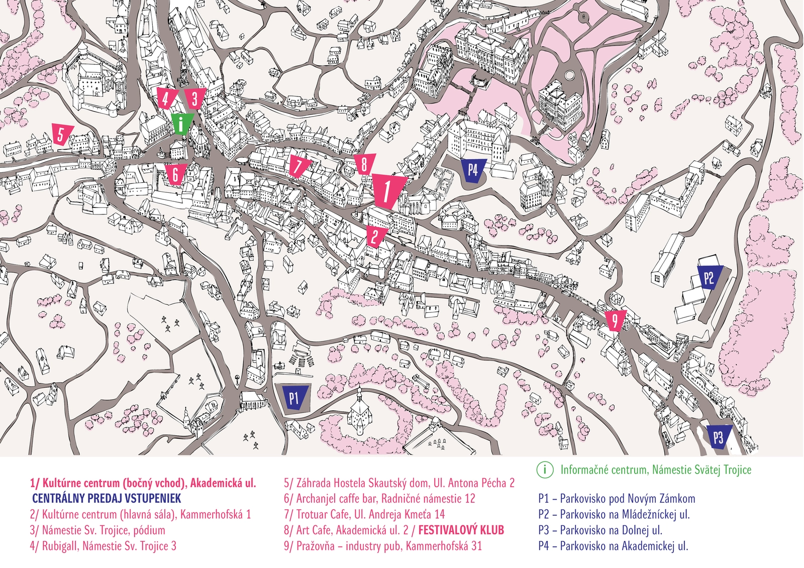 Po príchode na AMPLIÓN využite, niektoré zberné parkovisko. Do centra je z nich blízko, navyše si ušetríte nervy pri kľučkovaní úzkymi štiavnickými uličkami, do ktorých sa naviac autá ani nehodia. V centre hľadať voľné miesto neodporúčame, nakoľko tam môžu parkovať iba majitelia rezidenčných kariet. Ani na Námestí sv. Trojice už nezaparkujete, od 1. 7. 2019 je tam pešia zóna. Záchytné parkoviská nájdete na ulici Mládežnícka (P2), pod Novým zámkom na ulici Novozámocká (P1) a na Dolnej ulici (P3), kde za osobné motorové vozidlo zaplatíte 1 € za hodinu alebo 8 € za deň. Parkovné sa platí Po – Ne od 7:00 do 18:00 hod. Platené súkromné parkovisko je tiež na Akademickej ulici pri budove bývalého gymnázia (v jame) (P4). Mapka, kde sú vyznačené, je pri bode 8. Viac tu.